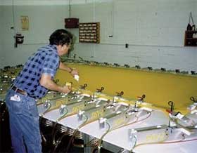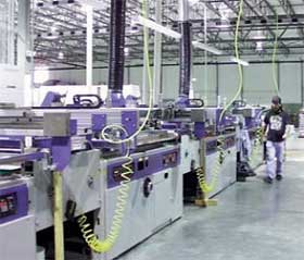很重要的一點(diǎn)是:當(dāng)我們改變設(shè)計(jì),提高一致性使印刷品在幾小時(shí)而非幾天完成時(shí),絲網(wǎng)印刷也可以借此降低成本、減少浪費(fèi)和傳遞時(shí)間。關(guān)鍵是絲網(wǎng)印刷要能持續(xù)有效工作。大多數(shù)車間獲得此效果的一種方法是努力轉(zhuǎn)向UV固化油墨和多色聯(lián)機(jī)印刷技術(shù)(圖2),達(dá)到一次印刷完成全部色彩的圖像。在絲網(wǎng)部門也有自動化設(shè)備,如自動絲網(wǎng)清洗、回收利用系統(tǒng),以及自動涂布裝置。這種自動化意味著絲網(wǎng)印刷機(jī)也需要大量的投入,但這也減少勞動力和成本浪費(fèi),提高了印刷一致性。