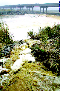 15日,記者在周至縣馬召鎮(zhèn)湯房村的這家名為“福利”的造紙廠前看到,一股黃黃的污水從墻底下流出來,進(jìn)村后,由明渠變成水泥管,出了村又變成明渠,一路幾百米,最后流到黑河里。在黑河橋下,一個(gè)由于挖沙石形成的沙坑內(nèi)蓄滿了污水。污水坑?xùn)|邊,有一小口,污水從此處流進(jìn)黑河。排污口由于在黑河水庫(kù)下游,因而沒有影響黑河向西安供水。