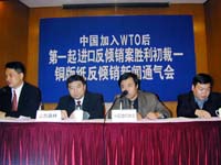 大會主持人姚旭升先生強調,這是中國進入WT0后第一例銅版紙反傾銷案件,這一初裁結果是國內銅版紙生產企業共同努力,運用WTO知識保護自己合法權益的結果,更是國家經貿委、外經貿部及相關職能部門高效、務實的工作作風的結果。國產紙的生產廠商已經懂得運用國際慣例,來維護自己正當的合法的權益、今天我們四家企業為了一個共同的目標走到了一起,為了維護好國內銅版紙市場公平競爭的環境而走到了一起,相信今后,還會有更多的企業為了維護中國紙業的健康發展而走到一起。