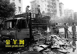 記者接到報料后在下午1時30分趕到現(xiàn)場時,消防車和警車已在場,大批警察正在維持現(xiàn)場秩序。一輛車牌為粵Y00825的南海籍貨車被燒毀停在路面中央,車頭被燒得只剩下一個鐵殼,擋風(fēng)玻璃燒熔了一地,左后車輪胎也被燒爆。該貨車上雖不見明火,但撲救的消防員仍在向車上冒煙的紙堆里灌水,有的消防員甚至在車上用鐵耙將燒焦的紙堆鉤出扔到路面上。在現(xiàn)場路面上隨處可見被燒毀的紙張,黑乎乎的紙灰飄落在積水上。