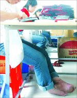 工人光著腳坐在工作前臺,將疊好的紙巾塞進包裝袋內