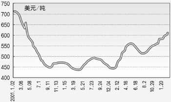 2003 年以來,由于美國及全球經濟的復蘇,特別是中國進入了新一輪經濟增長周期,全球的原材料價格呈現不斷上揚的趨勢,如鋼鐵、銅、石油等價格已創出近幾年的新高。這一輪原材料價格的上漲,同樣波及到了造紙行業。造紙的原材料紙漿價格從 2003 年年初就開始緩慢地上升,進入 2003 年 7 月份以后,出于生產與填補庫存的需要,貿易量迅速增加帶動了全球紙漿市場價格上揚, 2003 年年底,加拿大、美國漂白針葉木硫酸鹽漿價格上漲至每噸 560 美元和 540 美元,約上漲 15% ;加拿大、美國漂白闊葉木漿每噸達到 540 美元與 530 美元,上漲幅度也在 15% 左右。到 3 月 9 日,國際紙漿價格已經創出兩年來的新高達到 608 美元 / 噸。而廢紙價格方面,目前美國廢紙自 2004 年 2 月中旬以來持續上揚,至今已由每噸 140 美元大幅提升到 165 美元,歐洲廢紙價格也自 2 月中旬的 127 美元漲至 140 美元。國內方面,雖然紙漿價格在 2003 年總體上漲有限,僅上漲約 3% 左右,但進口木漿價格由于采購價與運費的上漲而平均上漲約 20% 。由于廢紙本身上漲約 10% 左右,加上國際海運價格的上漲,青島、廈門等港口到岸價已由 2003 年年初的 110 美元 / 噸上漲到 140 美元 / 噸以上,由此推動脫墨漿漲幅達 30% 左右。草漿由于糧食的上漲也出現大幅上漲,由往年 220 元 / 噸左右上漲到 300 元 / 噸以上,漲幅高達 40% 左右。