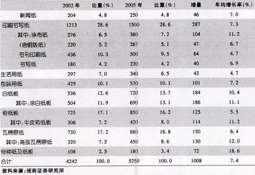 但是,即便如此,我國紙和紙板的人均消費量還是比較低的, 2002 年我國城鎮人口人均紙和紙產品消費量為 90 公斤,高于世界平均消費量( 56 公斤),但低于發達國家的消費水平( 200 公斤以上)。江南證券研究發展部行業研究員杜敏杰認為,造紙行業 8 %的增長速度比較合理。按照這個發展速度, 2010 年我國紙品的總消費量將達到 8018 萬噸,城鎮人口人均紙品消費量將達到 167 公斤。招商證券行業研究員王鵬認為, 2002 年 -2005 年國內紙及紙板市場需求年均增長率在 7.4% 左右 , 其中涂布紙年均增長率在 11.2%, 牛皮箱紙板年均增長率在 11.2%, 特種紙及紙板年均增長率在 18.6% 。因此,從需求看,造紙行業面臨較大的發展空間和盈利空間。