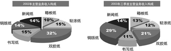 到 2002 年年底,晨鳴紙業機制紙的產量已達 104.33 萬噸 , 成為首家年產量超過 100 萬噸的上市造紙企業, 2003 年公司年產量可達到 130 萬噸, 2005 年可達 205 萬噸。公司的主導產品是輕涂紙、雙膠紙、書寫紙、新聞紙、銅版紙和箱板紙。除了箱板紙的銷售利潤率較低( 22 %)之外,其它產品的銷售利潤率都保持在 30 %以上,表明公司產品定位高,盈利能力強。