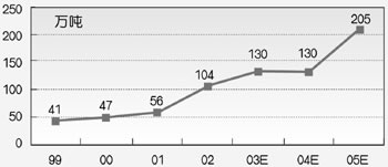 第三,最為重要的是,國內對紙產品的需求十分旺盛。我國紙業產銷量從 1995 年開始已位居世界第二, 1991-2002 年的 12 年間我國紙和紙板總產量和消費量分別以年均 8.94% 和 9.57% 的速度增長。 2002 年更是出現跳躍式的增長,紙和紙板總產量達到 3,780 萬噸,比 2001 年增加 8.13% ;紙和紙板的總消費量為 4,332 萬噸 , 比 2001 年增長 17.62% 。從消費總量來看, 2002 年已經躍居世界第二。并且已經超過生產量。 2003 年國內造紙行業將繼續保持較高的增長,據國家造紙行業協會披露, 2003 年 1-11 月份,國內累計生產紙漿 1188 萬噸,同比增長 18.63% ;機制紙 2244 萬噸,同比增 17.36% ;其中主要品種新聞紙生產 189 萬噸,同比增長 9.96% ;膠印書刊紙 46.9 萬噸,增長 27.2% 。包裝用紙板 1478.5 萬噸,增長 18.62% 。但這還不能滿足國內對紙產品,特別是高檔紙產品的需求,近年來,我國進口成品紙及紙板約占年消費量的比重一直在 15% 左右, 2002 年進口量達到 552 萬噸,中間品紙漿、廢紙的進口量也很大。由于我國是一個森林資源嚴重缺乏的國家,因此在中短期內我國紙漿、廢紙的進口仍將較快地增長。