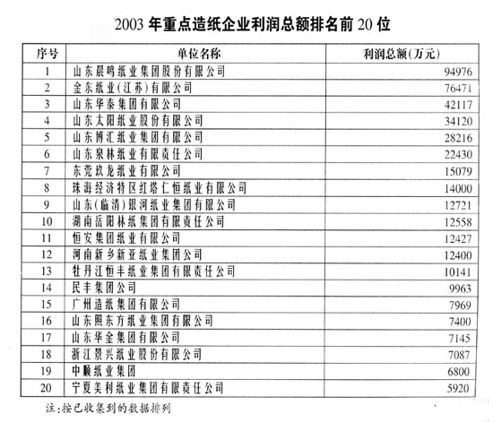 2003年重點(diǎn)造紙企業(yè)利潤總額排名前20位(表)