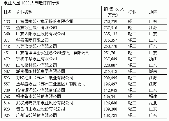 紙業入圍1000大制造商排行榜