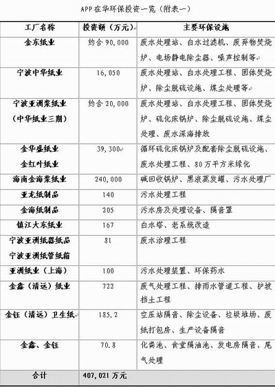 在生產過程中,通過巨額的環保設施投入、先進的技術、科學的管理,努力使其對環境的影響降至最低。目前,集團在華企業在環保設施方面的投入已高達40億元人民幣(附表一)。這種投入在中國是前所未有的!集團旗下各企業多次榮獲環保方面獎項,如環保標準達到甚至優于世界水平(附表二)的金東紙業,于2003年10月獲“國家環境保護百佳工程”;2004年6月獲得由國家環?偩譃槠髽I環境保護工作所設的最高榮譽——“國家環境友好企業”稱號。在獲獎的八家企業中,金東作為唯一一家造紙企業獲此殊榮。