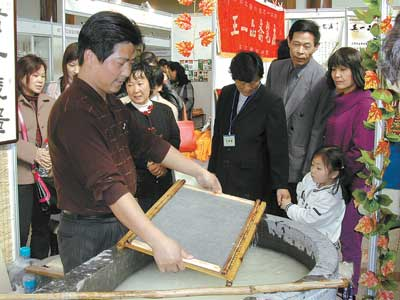 曹式宣紙傳人表演傳統(tǒng)造紙 被喻為“當(dāng)代蔡倫”(圖)