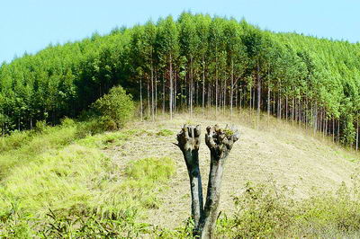 景谷縣鐘山鄉(xiāng)南景村弄令社馬家井桉樹無(wú)性系基地旁,齊刷刷的桉樹林與剛剛燒過(guò)的荒地形成鮮明的對(duì)比。