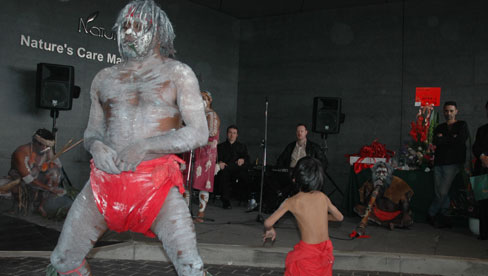 原住民與小孩模彷袋鼠吃尤加樹葉唯妙唯肖。