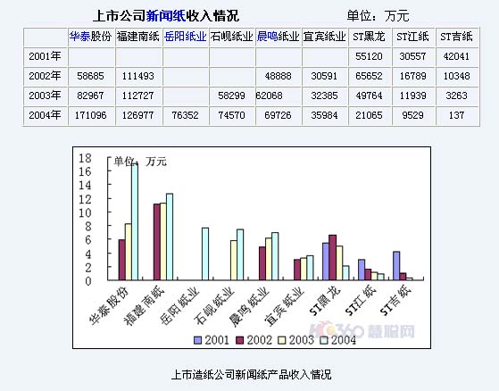 2004年新聞紙上市公司收入最高的是華泰股份,收入超過17億元,華泰同時也是新聞紙收入增長最快的企業(yè)。在2001年時,華泰還沒有新聞紙的生產(chǎn),但是投資的10萬噸/年高級雜志紙項目于10月份竣工投產(chǎn);2002年華泰根據(jù)紙張市場行情,將10萬噸/年高級雜志紙生產(chǎn)線改產(chǎn)新聞紙,新聞紙年生產(chǎn)能力達到16萬噸,當年實現(xiàn)新聞紙收入5.87億,實現(xiàn)毛利2.1億,毛利潤高達35.89%,新聞紙占公司總收入的44%,占公司毛利的57%。2003年7月,華泰15萬噸/年輕量涂布紙項目竣工,根據(jù)市場需求,該紙機經(jīng)過設備微調(diào)改產(chǎn)新聞紙,實際產(chǎn)能可達20萬噸/年,該項目的上馬使華泰成為國內(nèi)最大的新聞紙生產(chǎn)廠家,該生產(chǎn)線當年生產(chǎn)新聞紙8.3萬噸,2003年華泰實現(xiàn)新聞紙收入8.3億,比02年增長41%,實現(xiàn)毛利2.7億,同比增長27%。2004年,華泰20萬噸/年的新聞紙項目全面達產(chǎn),加上以前的16萬噸/年的項目,華泰新聞紙產(chǎn)能達到36萬噸,2004年實際產(chǎn)新聞紙37.22萬噸,排第一名,比第二名福建南紙高出8萬噸。新聞紙收入高達17.1億,比2003年翻一倍,毛利潤達到5.1億,新聞紙占公司總收入的比重由2002年的44%,增長到了65%;毛利潤占公司的比重由2002年的57%增長到了81%。由于原材料的上漲和市場競爭的激烈,華泰的毛利率稍有下滑,由2002年的35.89%降到了2004年的29.69%。