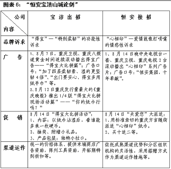 而恒安集團發(fā)展之道所謂的“狠”,其實是一種“執(zhí)著”。它不僅體現(xiàn)在早期實施目標聚集戰(zhàn)略時對區(qū)域市場一個個“以點帶面”的強行突破,也反映在不斷通過技術(shù)創(chuàng)新等方式,專注做深做細同一行業(yè)(比如衛(wèi)生巾產(chǎn)品的升級換代);更表現(xiàn)在與諸多跨國公司強勁對手爭鋒時,毫不退讓,寸土必爭的企業(yè)精神和求真務(wù)實的科學態(tài)度。這一點在1999年8月一場“恒安寶潔山城論劍”的事件中演義的淋漓盡致。事件大概背景是:1998年末,恒安“心相印”紙巾已占據(jù)重慶高檔紙巾市場1/3強,居市場領(lǐng)先地位。而寶潔繼成功推出婦孺皆知的飄柔、海飛絲、碧浪、汰漬等數(shù)十個強勢品牌后,決定以香港、重慶兩地作為試點,于1999年推出由其德國公司生產(chǎn)的“得寶”系列紙巾,意欲以其“功能定位三板斧+廣告轟炸”的一貫行銷模式,一統(tǒng)高檔紙巾市場江湖。于是,兩者之間市場遭遇戰(zhàn)再所難免。恒安面對寶潔來勢洶洶的挑戰(zhàn),從品牌訴求、廣告、促銷和渠道運作等四個方面實施了強有力的積極防御(見圖表6),成功捍衛(wèi)了重慶高檔紙巾市場江湖霸主的地位。
