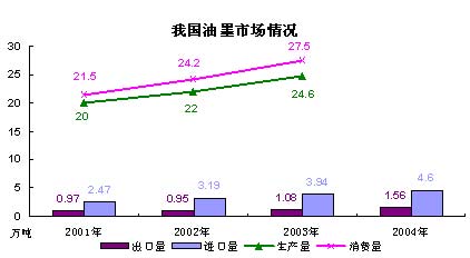 隨著我國印刷工業的快速發展,油墨的消費量以年均13%的速度增長,產量的增長速度也達到11%。我國進口油墨的增長速度年均高達22.5%,2004年我國進口油墨占消費量的14.3%,并且有進一步增長的勢頭,而我國油墨的出口量只占產量的4.5%上下。
