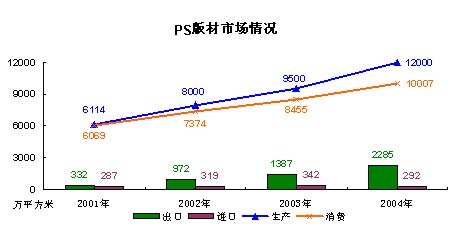 總體來看,我國PS版材產量高于消費量,并且產量的增長速度要高出消費量增速7個百分點。近幾年,我國PS版材產量年均增長25%,在2002年的增長速度超過了30%,消費量年均增長速度為18.2%。2001年我國PS版材出口量占生產量的5.4%,到了 2004年出口量占到產量的19%,出口增長速度高達90%,而進口量有下降趨勢。