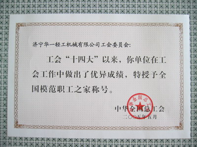 (中國紙網訊 通訊員郭慶立報道)今年5月,濟寧華一輕工機械有限公司工會委員會被中華全國總工會授予“全國模范職工之家”榮譽稱號。并頒發了獎牌和榮譽證書。這是華一公司繼2005年3月榮獲山東省輕工紡織煙草行業工會工作先進單位” 榮譽稱號之后,又獲得一國家級殊榮。