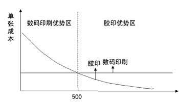 下面舉例說明二者所具有的市場(chǎng)互補(bǔ)性。短版印刷最突出的優(yōu)勢(shì)就是方便、快捷,當(dāng)然在成本上也比長版印刷高,具體高多少,無法簡單衡量,主要依印量而定。數(shù)碼印刷的成本是固定的,無論印多少,單張成本不變,但是長版印刷由于存在版費(fèi),使得單位成本隨著印張的增加而減少。舉個(gè)例子,制版花了1200元錢,僅印一本,總的制版費(fèi)就是1200塊一本,而印10本,100本,1000本,版費(fèi)就被分?jǐn)偭耍瑔伪镜某杀咀匀痪徒迪聛砹耍吭酱笤奖阋耍圆蝗菀子?jì)算具體的成本。根據(jù)數(shù)碼印刷經(jīng)營者的經(jīng)驗(yàn)判斷,如果印張?jiān)?000以上,90%以上的客戶都會(huì)選擇長版印刷,因?yàn)樗某杀緯?huì)比短版低得多,當(dāng)然不排除有客戶因?yàn)闀r(shí)間的關(guān)系選擇短版印刷,畢竟出片、打樣、簽樣都很耗費(fèi)時(shí)間。2004年以后,北京、上海等城市的數(shù)碼印刷發(fā)展較快,目前比較公認(rèn)的是一般印張?jiān)?00左右時(shí)數(shù)碼印刷和膠印的單價(jià)趨同,如果再考慮時(shí)間因素,膠印不存在優(yōu)勢(shì)。二者互補(bǔ)性的圖示如下:
