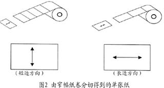 對于我們常用的單張紙來說,如何來標定它的絲縷方向呢?我們知道,印刷用的單張紙都是由卷筒紙經過分切以后得到的,而卷筒紙的紙帶方向即為紙張絲縷方向,但對于我們常用的單張紙來說,如何來標定它的絲縷方向呢?我們知道,印刷用的單張紙都是由卷筒紙經過分切以后得到的,而卷筒紙的紙帶方向即為紙張絲縷方向,但由卷筒紙分切成單張紙時有多種分切方法。如圖1所示,