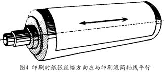 對于常規膠印來說,水是不可或缺的。正是利用油水互不相容的原理,膠印工藝才能夠正常地進行。然而水在印刷中又有著很大的副作用,其中之一便是它能使紙張吸水膨脹,使得紙張的尺寸發生改變,從而影響印刷中的套準精度。在受濕的情況下,紙張在絲縷方向和膨脹方向的伸長率不同,膨脹方向上的尺寸變形率要比絲縷方向大。另一方面,紙張的挺度在膨脹方向和絲縷方向也有很大的差別,絲縷方向上的挺度要明顯大于膨脹方向,而印刷過程中又要求紙張能夠很服貼地包覆在滾筒表面上印刷,以利于紙張的順利壓印、平穩交接和防止紙張拖梢的甩臟。從這兩方面我們不難理解, 印刷時應該使紙張絲縷方向和印刷滾筒軸線平行,如圖4所示。