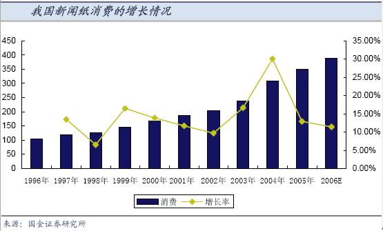 ●國內新聞紙消費近10年來保持了12%左右的增長,雖然我們依然看好國內新聞紙的中長期前景,但是我們認為隨著宏觀調控對房地產業的影響將逐漸顯現,占平面廣告業務量最大的房地產廣告將有所減少,新聞紙耗用量增長將放緩。預計06年、07新聞紙需求增長率約為10-11%。