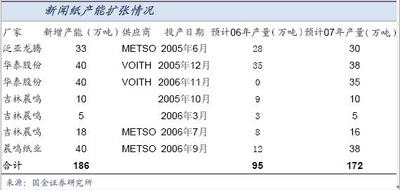 ●新聞紙產能擴張快,產能釋放比市場預期提前,總體共給過度。我們預計2006年新聞紙將明顯供大于求,新聞紙價格將低于行業平均成本。部分企業將陷入經營困境,甚至退出競爭。新聞紙市場可能會逐漸呈現晨鳴、華泰、泛亞三分天下的格局。