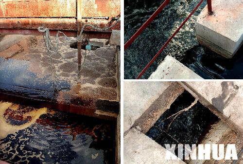 進入造紙廠的酸析沉淀池中的水本應透明(左圖);已經初步處理的中段水纖維回收池水質依然漆黑(右上);未經處理的污水通過暗溝排放(右下)(9月11日攝)。