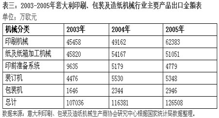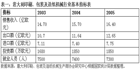 2005年,意大利印刷、包裝及造紙機(jī)械行業(yè)克服種種不利因素,加大技術(shù)革新力度,不斷研發(fā)新產(chǎn)品,逐步完善售后服務(wù)體系,使國際市場份額不斷得以鞏固。整個(gè)行業(yè)出口的各種機(jī)械設(shè)備金額比上年增長了8.7%,出口銷售占行業(yè)銷售總收入的77%,是意大利機(jī)械行業(yè)中增長最快的行業(yè)。