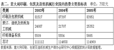 在意大利整體經(jīng)濟(jì)不景氣的大環(huán)境下,2005年,意大利國內(nèi)消費(fèi)各種印刷、包裝及造紙機(jī)械金額達(dá)到11.5億歐元,比上年略升了0.3%,持續(xù)保持增長。其中:印刷及包裝機(jī)械消費(fèi)了8.4億歐元,比上年下降了3.9%,占行業(yè)消費(fèi)總額的73.02%;裝訂、造紙及紙板加工機(jī)械消費(fèi)了2.54億歐元,比上年增長了16.8%,占22.05%;印前準(zhǔn)備系統(tǒng)消費(fèi)了0.56億歐元,比上年增長了2%,占4.93%。(詳見表二)