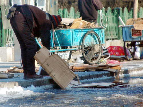 8日上午9時(shí)許,在哈市道外區(qū)靖宇公園門前,一個(gè)收廢品的小販為了將收來(lái)的紙殼箱賣出更多的重量,竟將部分紙殼箱泡在水里,而后用干的紙殼箱包住濕的紙殼箱,然后去賣給廢品收購(gòu)站,這種欺騙實(shí)在不應(yīng)該。