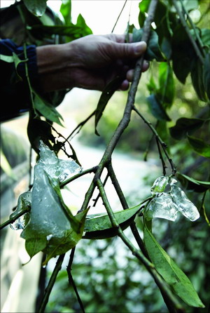 沙坪鎮華南虎自然保護區內海拔1200米處的樹葉上仍有冰掛