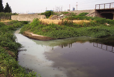 就在太陽紙業附近鐵路橋下排污口兩米之外,淺淺的河溝里還有污水留下的痕跡。