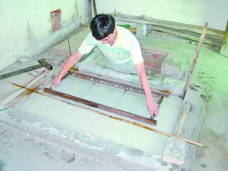 昨天上午,家住大隗鎮大路溝村的黃保靈,正站在家中齊腰深的“腳坑”里,用一竹制的器物在一個大水坑里撈紙漿,他手腕一抖,竹制的器物上便沾了一層米色的紙漿,控一下水后,他把竹制的器物往下一扣,三小張麻紙就成形了。黃保靈說,他這道工序叫抄紙,也叫撈紙。面前的水坑,叫“陷坑”,坑底排列了一層竹子,下面壓著的就是紙漿。用一邊的木桿搗搗下面的竹子,紙漿就會從下面冒出來,他再用另一根木桿攪一攪,就可讓陷坑里的紙漿變得均勻。