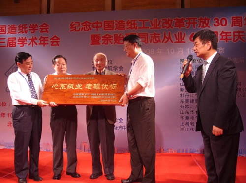 由中國造紙學會、中國造紙協會、中國工商聯紙業商會和中國制漿造紙研究院主辦,中國造紙學會和中國造紙雜志社承辦的“紀念中國造紙工業改革開放30周年懇談會暨余貽驥同志從業62周年慶祝會”于2008年10月16日在北京隆重舉行。 此次盛會由中國造紙學會秘書長、中國制漿造紙研究院院長曹振雷主持,第十屆全國政協副主席王忠禹,中國輕工業聯合會會長陳士能,中國造紙協會理事長錢桂敬,中國造紙學會理事長、中國輕工集團公司總裁陳學忠,中國工商聯紙業商會會長、山東太陽紙業股份有限公司董事長李洪信等領導祝賀了中國造紙工業在改革開放30年走過的輝煌歷程和取得的偉大成就,并對我國造紙工業的美好發展前景充滿了信心;作為行業代表、企業代表和贊助單位代表的山東泉林紙業有限責任公司董事長、總經理李洪法,作為教育屆代表的陜西科技大學副校長張美云,作為科研院所代表的中國制漿造紙研究院副院長張黎雨也在會上發表了熱情洋溢的講話。 今年是我國實施改革開放30周年,在這30年的改革進程中,我國造紙業走出了一條有中國特色的紙業之路,到會的領導一致認為,我國造紙工業的蓬勃發展、迅速崛起都凝聚著每一位造紙科技工作者的貢獻。今年也是我國造紙業前輩余貽驥同志九十華誕,同時也是余老從事造紙行業62周年。余老為我國造紙事業的發展嘔心瀝血,貢獻了畢業的精力;也見證了我國造紙業的光輝歷程。本次會議舉行了余貽驥同志自傳及論文集發行儀式,為表彰其為中國造紙業發展做出的貢獻,中國造紙學會、中國造紙協會、中國工商聯紙業商會和中國制漿造紙研究院四單位聯合向余老贈送了牌匾——“心系紙業 老驥伏櫪”。