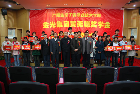 08年,金光集團黃奕聰慈善基金會設立高校獎學金項目回饋社會,在全國農林院校中挑選了8所高校設立獎學金,廣西生態工程職業技術學院成為了其中唯一一所高職院校。獎學金設立后,學校和企業人員通力合作,按照獎學金宗旨和管理辦法,完成了廣西生態工程職業技術學院金光集團黃奕聰獎學金在該校的第一屆評選活動。2008年12月29日,APP中國林務事業部廣西首席朱開福一行代表企業到該校參加了獎學金頒獎儀式。