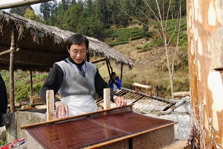 村民們除了利用趕場去外鄉鎮購買原料外,還就地取材。每年七八月間,用刀剝下構樹主干或枝干的皮,再將皮的綠色表層去掉,由此開始了古法造紙的工序。整個生產過程都是手工作業。