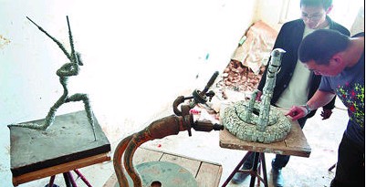 陳余介紹,這些廢紙箱、爛鐵絲、小鐵片、生銹的機(jī)器零部件等,都是從廢品收購(gòu)站淘的,廢銅爛鐵經(jīng)焊接就成了形態(tài)各異的藝術(shù)品。陳余說(shuō),做雕塑最常用的就是石膏和玻璃鋼,這些材料價(jià)格不菲,一般做一個(gè)2公斤的雕塑就需100多元錢(qián)。而用廢紙打的紙漿照樣可以做雕塑,成本非常低。“藝術(shù)品在于它的創(chuàng)意,不在于原材料的奢侈。”陳余和他的同學(xué)們都認(rèn)為,藝術(shù)家更應(yīng)關(guān)注生態(tài)環(huán)境,減少污染和浪費(fèi),讓藝術(shù)傳遞低碳和環(huán)保的意義。