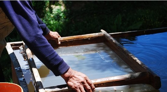 今年61歲的次仁多杰從15歲開始學習手工制作藏紙,并堅持至今。他告訴記者,藏紙的制作有六道工序:用刀子將狼毒草根部去皮去芯;取中間白色纖維組織搗爛熬煮;撈出后用石頭搗制成漿;然后倒入水中攪拌均勻;之后將紙漿澆入紗布框內;最后曬干成型。為了提高藏紙的亮度和柔韌性,煮制過程中要加入堿。澆漿則完全憑工匠的經驗和手感,以保證紙張的厚薄均勻,所以這也是藏紙制作中關鍵的一步。