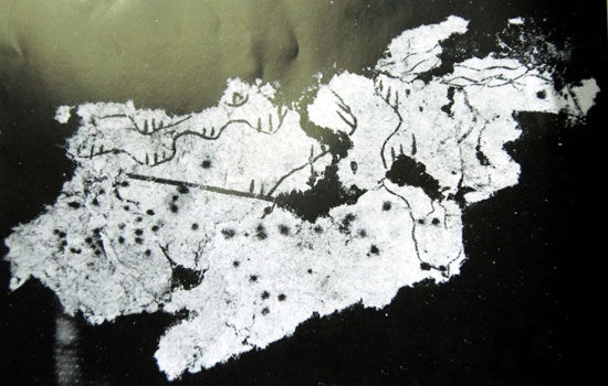 天水放馬灘西漢初年5號墓出土的紙質(zhì)地圖。該圖殘長5.6厘米、寬2.6厘米,經(jīng)文物考古專家斷定為西漢文帝或景帝(公元前179年-前143年)時期的紙質(zhì)地圖