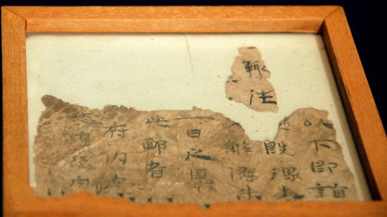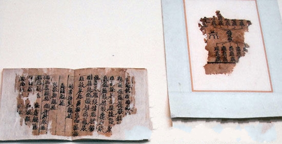 甘肅博物館館藏的敦煌出土的懸泉墨書紙,公元265年到316年。懸泉紙是1992年在甘肅敦煌懸泉置遺址發(fā)現(xiàn)的。該遺址共出土紙張470余件,其中寫有文字的紙殘片10件,時代從西漢武、昭帝始,經(jīng)宣、元、成帝至東漢初及晉。 中國甘肅位于陸上絲綢古道,從東部的天水至西部的敦煌橫跨1600多公里,加上多數(shù)地區(qū)氣候干燥,境內(nèi)古紙遺存十分豐厚,是見證中國古代造紙業(yè)發(fā)展歷史的“自然博物館”。