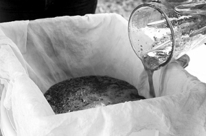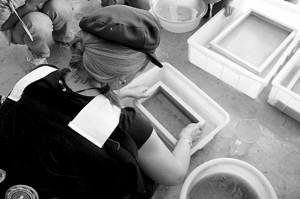 當天,西格麗德選用了瑞香狼毒樹皮、廢舊牛仔布和純麻布3種材料,并依次展示了納西族和目前歐洲流行的造紙方法。三種材料的造紙過程大抵相似,簡單地可總結為浸泡、錘打、抄造、晾曬等幾個步驟。整個活動現場一直回蕩著納西族高亢的音樂小調,和手工造紙的氛圍甚是相得益彰。她自身所帶的斯堪的納維亞氣質融入到中國少數民族古老神秘的文化傳統(tǒng)中,僅僅是在這種創(chuàng)作的行跡(而非作品)中,便油然而生出某種令人歡欣的浪漫氣息。