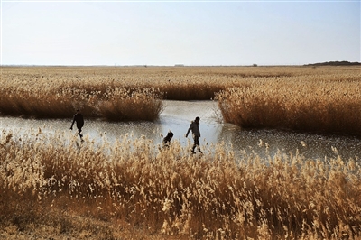 工作人員穿梭于蘆葦叢中,一籌莫展。.