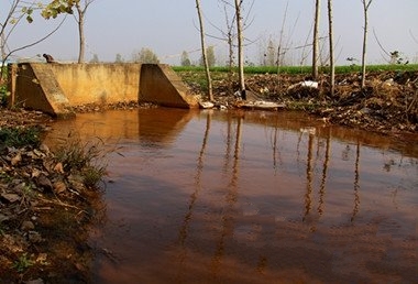 距銀鴿投資廠房約1公里處的污水排口正流出污水,漯河市環(huán)保局工作人員稱污水主要由銀鴿投資及興貿(mào)鈦業(yè)等企業(yè)排出,而銀鴿投資的排量最大。(圖片由漯河當?shù)厥忻裉峁掌瑪z于12月中旬)