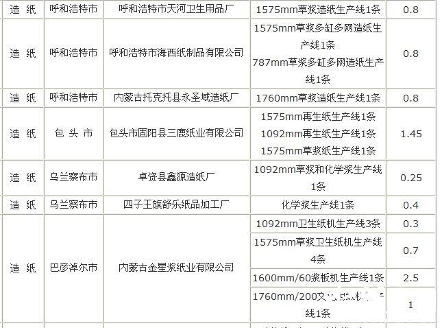內蒙古2011年淘汰造紙落后產能名單