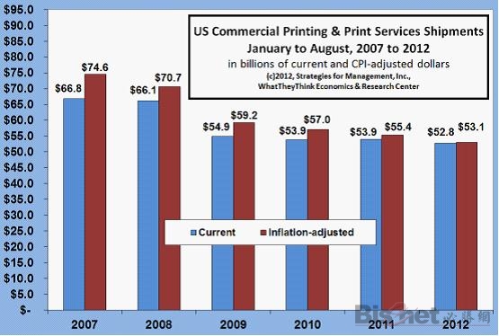 美國著名印刷經濟學者Joe博士在其博客中發布了美國最新8月份商業印刷出貨量數據。2012年8月,美國商業印刷出貨量再度下降,為69億美元,比去年同期同比減少2.05億美元,約下降2.9%。若加上美元匯率的影響,2012年前8月美國商業印刷出貨量通過比共減少2.1%,去除通貨膨脹后為4.1%