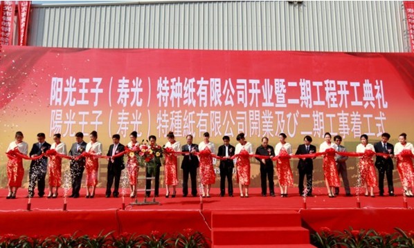 10月18日,陽光王子開業暨二期工程開工典禮在陽光王子(壽光)特種紙有限公司隆重舉行。來自壽光市黨政機關的有關領導,王子控股株式會社、全國各地的客戶朋友以及世紀陽光集團的干部員工共300多人出席了慶典儀式,集團公司董事長王東興介紹了陽光王子組建及發展中的有關情況,提出建設二、三期工程,形成年產特種紙15萬噸、打造中國特種紙第一品牌的宏偉目標。有關領導為公司開業剪彩、為二期工程開工奠基。