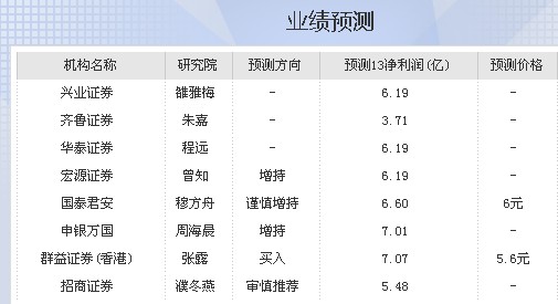 截止2013-12-26,6個(gè)月內(nèi)共有8家機(jī)構(gòu)對(duì)晨鳴紙業(yè)的2013年度業(yè)績作出預(yù)測(cè);預(yù)測(cè)2013年凈利潤 6.05億元,較去年同比增長 173.88%。其中2家機(jī)構(gòu)“增持”,1家機(jī)構(gòu)“謹(jǐn)慎增持”,1家機(jī)構(gòu)“買入”,1家機(jī)構(gòu)“審慎推薦”。最高預(yù)測(cè)6元 ,最低預(yù)測(cè)5.6元 ,平均預(yù)測(cè)價(jià)格5.80元