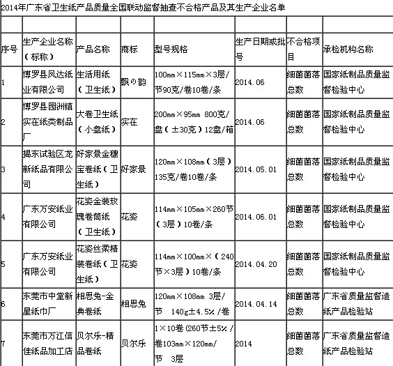 抽查發(fā)現(xiàn),標(biāo)稱博羅縣鳳達(dá)紙業(yè)有限公司、博羅縣園洲鎮(zhèn)實(shí)在紙類制品廠、揭東試驗(yàn)區(qū)龍新紙品有限公司、廣東萬(wàn)安紙業(yè)有限公司、東莞市中堂新星紙巾廠、東莞市萬(wàn)江信佳紙品加工店等6家企業(yè)生產(chǎn)的7批次衛(wèi)生紙產(chǎn)品不合格,涉及細(xì)菌菌落總數(shù)1個(gè)項(xiàng)目。