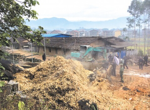 當(dāng)天上午,記者跟隨執(zhí)法人員來(lái)到位于仙游縣度尾鎮(zhèn)霞溪村與云居村交界一處造紙的紙漿廠。該紙漿廠建在當(dāng)?shù)匾蛔∩侥_下,這家造紙廠建有一個(gè)深度2米多的發(fā)酵池,池邊堆放著加工成竹渣的紙漿原料,這些原料已發(fā)酵散發(fā)濃煙,氣味難聞。而發(fā)酵池內(nèi)還留有黑色的紙漿殘?jiān),地上也滿是黑色紙漿滴漏的紙屑?xì)堅(jiān)。在生產(chǎn)設(shè)備相當(dāng)簡(jiǎn)陋的發(fā)酵池旁,一臺(tái)用于碾碎毛竹的機(jī)器十分醒目。執(zhí)法人員用挖掘機(jī)將造紙廠的廠房、設(shè)備和原料全部摧毀填埋,將生產(chǎn)設(shè)施徹底搗毀。