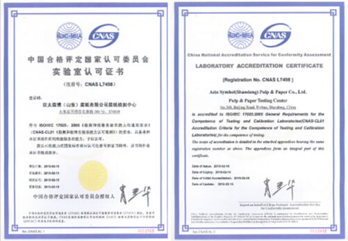 近日,經CNAS(中國國家合格評定委員會)審定、CNAS秘書長批準,亞太森博(山東)漿紙有限公司漿紙檢測中心正式通過CNAS國家實驗室認可、取得了由CNAS頒發的ISO/IEC17025:2005認可證書。