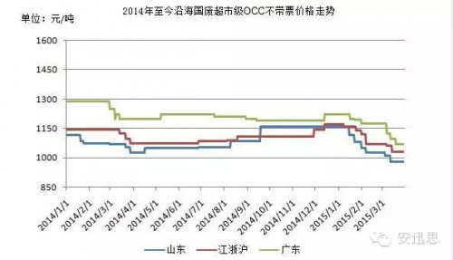 2014及2015年春節(jié)過后國廢OCC因貨量充裕原因價(jià)格傳統(tǒng)下行,然2015年跌勢拐點(diǎn)較2014年提前近一個(gè)月左右且降幅增大。